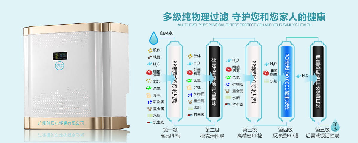太空一号互联网智能纯水机(JBR-RO-B)除了搭载超强的五大智能化系统以外,其传统的过滤工艺依旧非常强大,五级超强物理过滤组合,即:“高品质PP棉、椰壳活性炭、高精密PP棉、陶氏RO反渗透过滤膜、后置椰壳活性炭”,能有效的去除水垢、重金属、抗生素、细菌病毒、铁锈、泥沙、余氯、异味、胶体等,保证制水品质的健康和安全;超低1:1微废水比傲视群雄,佳贝尔太空一号互联网智能纯水机(JBR-RO-B)在传统的过滤工艺上进行了改良,增设了一道废水循环系统形成了更先进的二级物理过滤循环系统,把废水重复利用,层层循环层层过滤,保证了超低1:1微废水比;整机的材料设计包括外壳、滤瓶、管道等均采用的是高品质的ABS食品级材质,用料更安全,产品使用更放心。